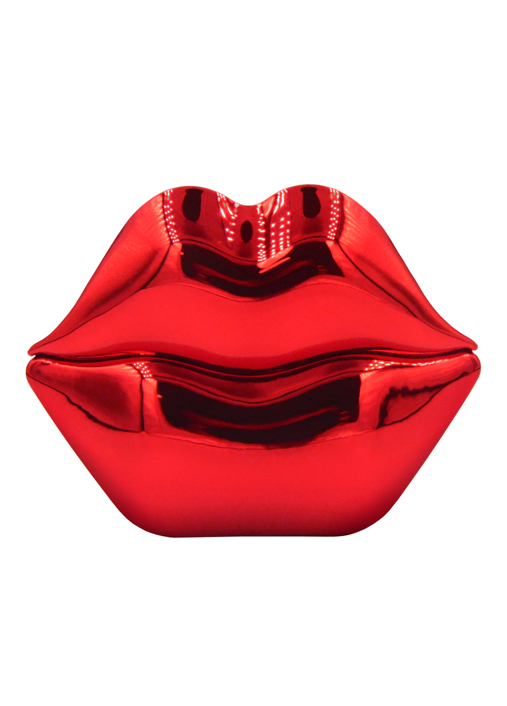 O design icônico do frasco, em forma de lábios metálicos vermelhos, reforça o