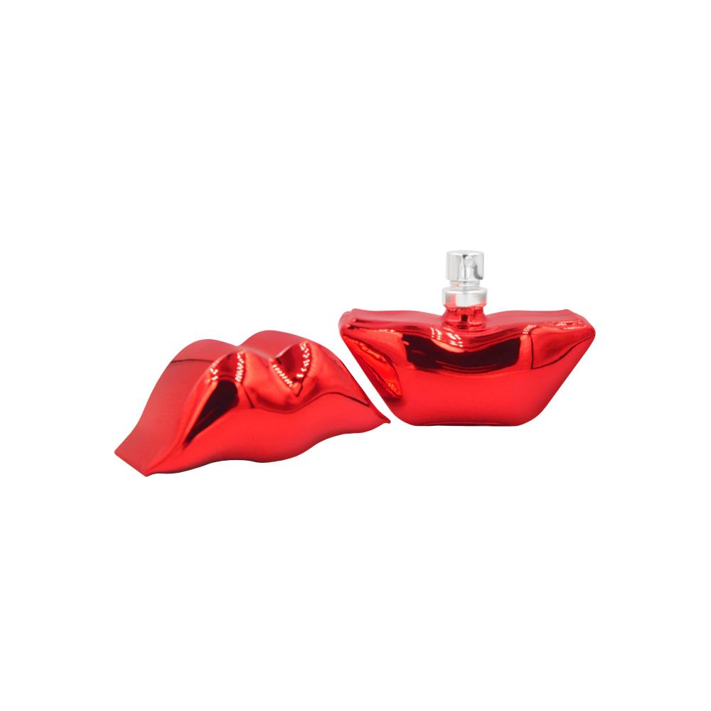 • • Frasco em formato de lábios vermelhos metálicos, sofisticado e provocante, simbolizando sedução e empoderamento.